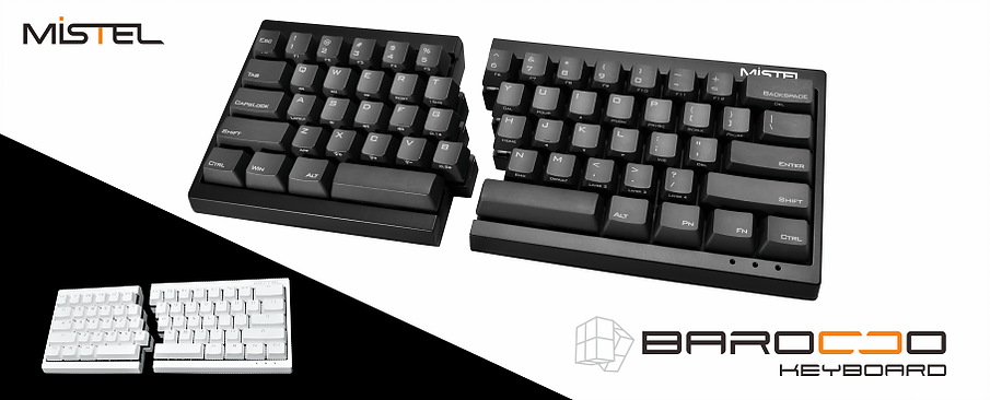 Which is why I searched until I found, with some relief, the Mistel Barocco Ergonomic Split Keyboard. It has a reasonable price point, it takes care of one of the harshest parts of the standard keyboard layout (the unforgiving straight-ahead arrangement of the keys), and it can be purchased using any of a variety of Cherry MX mechanical key switches.