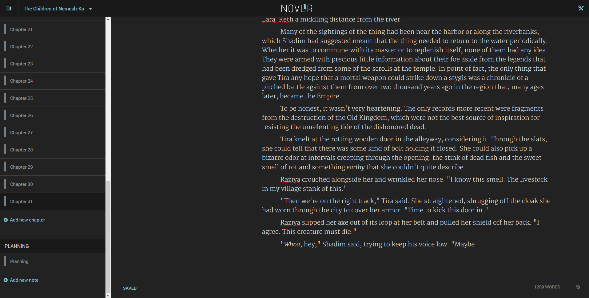 Basically, Novlr resolved a lot of problems that I’d been experiencing with several other word processing tools. Once I switched over to my Chromebook a couple of years ago, I found myself using Google Docs a lot. And Google Docs is good for relatively short-form stuff. But problems start to arise when your document surpasses about thirty or forty pages of solid prose. Docs begins to choke on that much data; as the doc gets longer, the load time gets worse and worse, the lag time gets more and more noticeable, and eventually it becomes borderline unusable. This is sort of an issue when it comes to writing novels, because I write novels in big long sprints. The project in the image, The Children of Nemesh-Ka (working title), has been written in 30k- to 50k-word chunks. It is currently sitting in the realm of 114k because I literally do not know when to stop writing please send help.